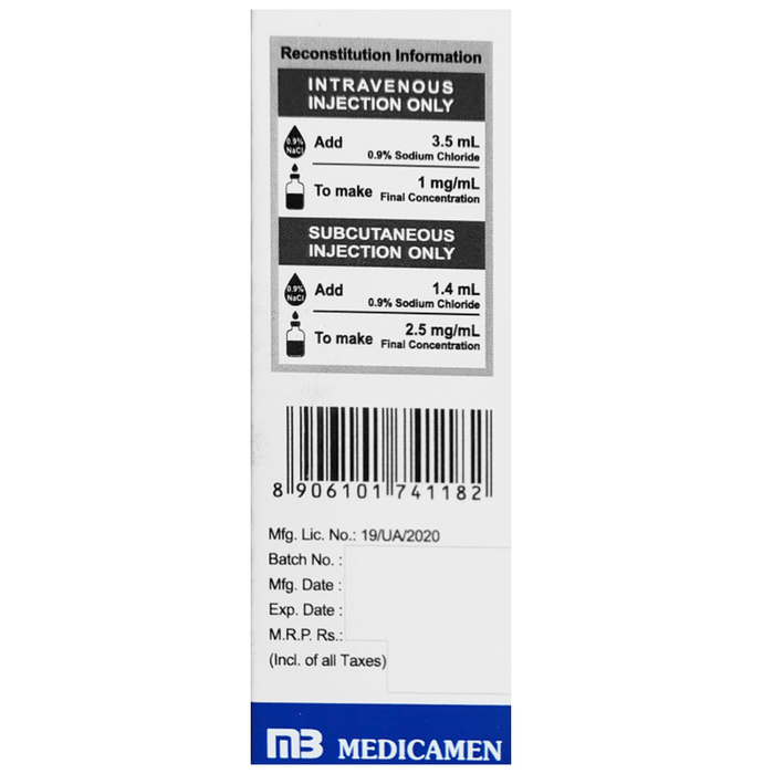 Marketer:Medicamen Biotech Ltd,Composition:Bortezomib (3.5mg), medicine_typedrugs,Packaging Detail:vial of 1 Injection,          Package:Vial,Qty:1,Product Form:Injection, prescription_required:Prescription Required,primary_use: