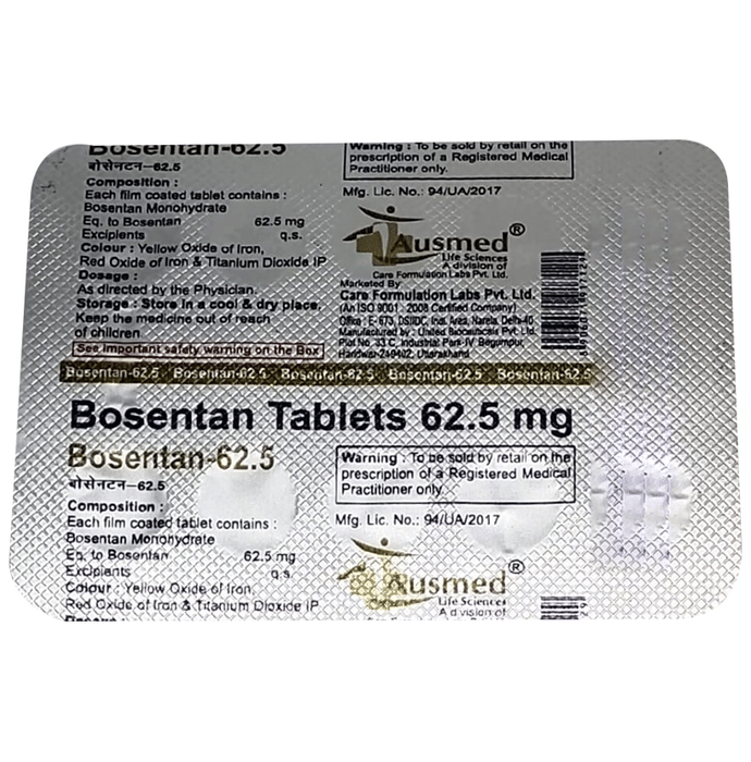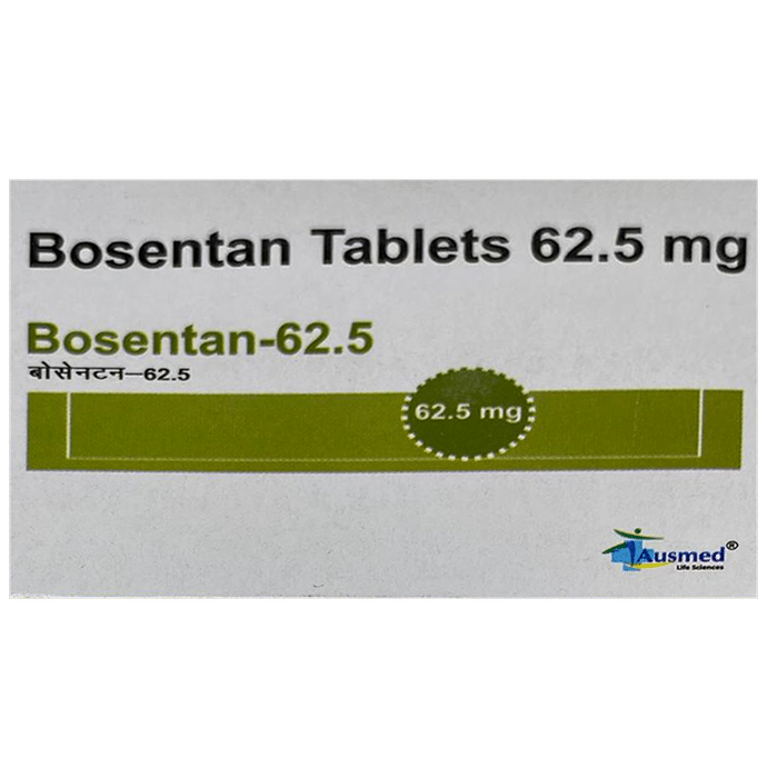 description:Bosentan 62.5 Tablet is a prescription medicine used to treat pulmonary arterial hypertension (high pressure in the blood vessels that carry blood from the heart to the lungs). It even helps to improve your quality of life, exercising ability and delay in disease progression. Bosentan 62.5 Tablet should be taken with or without food. This medicine should be used regularly to get the most benefit from it. The dose and how often you take it depends on what you are taking it for. Your doctor will decide how much you need to improve your symptoms. You should take this medicine for as long as it is prescribed for you.The most common side effects of this medicine include headache, swelling of the legs and ankles, and diarrhea. If these bother you or appear serious, let your doctor know. There may be ways of reducing or preventing them. Some serious side effects which mean your doctor should know immediately include Anemia (low number of red blood cells) and abnormal liver function such as nausea, vomiting, dark urine, fever, and dark urine. Your doctor might check you for blood tests to check for anemia and liver function.Before taking this medicine, let your doctor know if you have liver dysfunctioning. Inform your doctor if you are pregnant or breastfeeding. Women are suggested to use reliable contraceptive pills to avoid pregnancy and should continue even after one month of stopping the treatment. Your doctor should also know about all other medicines you are taking as many of these may make this medicine less effective or change the way it works.