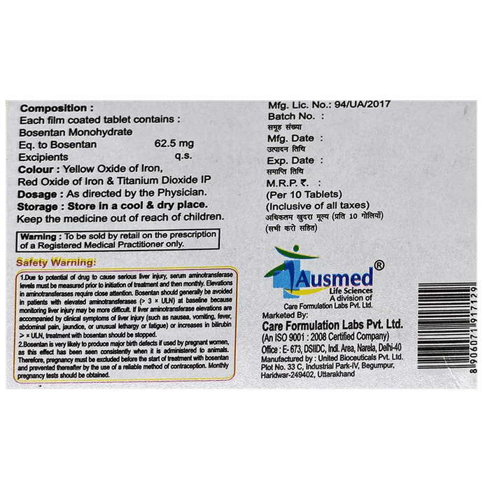 Marketer:Care Formulation Labs Pvt Ltd,Composition:Bosentan (62.5mg), medicine_typedrugs,Packaging Detail:strip of 10 tablets,          Package:Strip,Qty:10,Product Form:Tablet, prescription_required:Prescription Required,primary_use:
