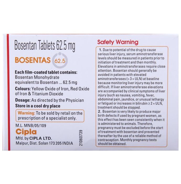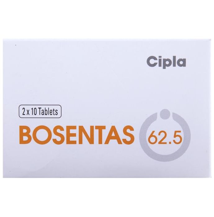 description:Bosentas 62.5 Tablet is a prescription medicine used to treat pulmonary arterial hypertension (high pressure in the blood vessels that carry blood from the heart to the lungs). It even helps to improve your quality of life, exercising ability and delay in disease progression. Bosentas 62.5 Tablet should be taken with or without food. This medicine should be used regularly to get the most benefit from it. The dose and how often you take it depends on what you are taking it for. Your doctor will decide how much you need to improve your symptoms. You should take this medicine for as long as it is prescribed for you.The most common side effects of this medicine include headache, swelling of the legs and ankles, and diarrhea. If these bother you or appear serious, let your doctor know. There may be ways of reducing or preventing them. Some serious side effects which mean your doctor should know immediately include Anemia (low number of red blood cells) and abnormal liver function such as nausea, vomiting, dark urine, fever, and dark urine. Your doctor might check you for blood tests to check for anemia and liver function.Before taking this medicine, let your doctor know if you have liver dysfunctioning. Inform your doctor if you are pregnant or breastfeeding. Women are suggested to use reliable contraceptive pills to avoid pregnancy and should continue even after one month of stopping the treatment. Your doctor should also know about all other medicines you are taking as many of these may make this medicine less effective or change the way it works.