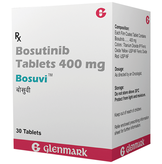 description:Bosuvi 400mg Tablet is an anti-cancer medicine. It is used in the treatment of certain blood cancer known as chronic myeloid leukemia. This medicine helps to slow down the growth and multiplication of cancer cells, thereby reducing the progress of the disease. Bosuvi 400mg Tablet should be taken as your doctor’s advice. Your doctor will decide how much you need to take and for how long. You may take it with or without food. Take it regularly and take it at a fixed time each day to help you remember. You should not stop taking the medicine suddenly and continue taking it for as long as the doctor has prescribed.Common side effects of this medicine include respiratory tract infection, nasopharyngitis, low blood platelets, decreased white blood cell count, anemia, headache, breathlessness, cough, increased liver enzymes, diarrhea, vomiting, nausea, and abdominal pain. If any of these bothers you, let your doctor know. There may be ways of reducing or preventing them. You should also inform the doctor immediately if it causes severe headaches, swelling in one leg, pain on breathing, or changes in vision or hearing.Before taking Bosuvi 400mg Tablet, you should let your doctor know if you have any other preexisting medical conditions. You should also inform the doctor about all other medicines that you are taking. Pregnant and breastfeeding women should not take this medicine as it can cause harmful effects to the developing baby.