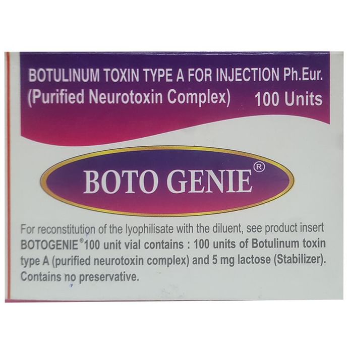 description:Boto Genie 100IU Injection is used in the treatment of overactive bladder, cervical dystonia, muscle spasm, and to prevent migraine. It treats muscle stiffness in the elbow, wrist, fingers, ankle, and toe muscles in adults. It also reduces the symptoms of severe underarm sweating. Boto Genie 100IU Injection is a prescription medicine that must be administered by a healthcare professional. You must receive the exact dose of it as per the prescription. An overdose of this medicine may have serious side effects on the body.The common side effects of this medicine are injection site pain, tiredness, Eye dryness, difficulty in swallowing, bruising, and skin rash. It may also cause injection site reactions such as redness, pain, and swelling in some people. The medicine can safely be used in children.Before taking this medicine, it is important to consult your doctor if you have any ongoing medication for any underlying disease. Pregnant and breastfeeding women must inform the doctor prior to the initiation of this treatment.