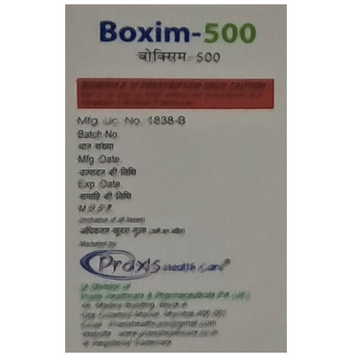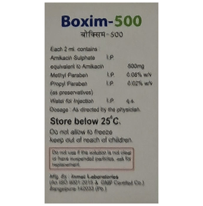 description:Boxim 500 Injection is an antibiotic used to prevent or treat a wide variety of bacterial infections. These may include infections of the urinary tract, bones, and joints, lungs (eg. pneumonia), brain, blood, among others. It is also used in hospitalized patients to prevent infections. Boxim 500 Injection works by stopping the growth of bacteria. It is given as a drip (intravenous infusion) or as an injection directly into a vein or a muscle under the supervision of a healthcare professional and should not be self-administered. It should be used regularly at evenly spaced time intervals as prescribed by your doctor. Do not skip any doses and finish the full course of treatment even if you feel better. Stopping the medicine too early may lead to the infection returning or worsening.Common side effects of this medicine include injection site reactions and increased blood urea. Consult your doctor if any of these side effects persist or if your condition does not improve despite treatment.Some patients receiving high doses may develop balance disorder (loss of balance), kidney damage, and hearing loss. Therefore, please follow all the instructions given by your doctor while using this medicine. Your doctor may also monitor you with regular kidney function tests, hearing tests, and urine tests during treatment. This medication is not recommended for use during pregnancy. Inform your doctor if you are pregnant, planning to conceive, or breastfeeding.