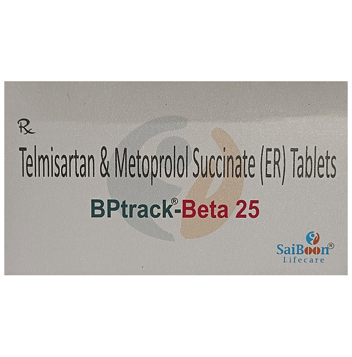 description:Bptrack-Beta 25 Tablet ER is a medicine used for treating high blood pressure. By lowering blood pressure, it helps in preventing future heart attacks and strokes. Early treatment with this medicine also improves the chances of survival in patients with heart attacks. It is advised to take Bptrack-Beta 25 Tablet ER with food at a fixed time each day to maintain consistent levels of medicine in the blood. Keep taking it for as long as advised by your doctor. Even if you feel well, do not stop this medicine on your own because high blood pressure often has no symptoms. If you stop taking it, your condition may get worse. Keeping active with regular exercise, reducing your weight and eating a healthy diet will also help control your blood pressure. Follow your doctor’s advice while taking this medicine.Some common side effects of this medicine include headache, weakness, dizziness, decreased blood pressure,  increased potassium level in blood, orthostatic hypotension (occasionally with syncope), breathlessness, nausea, vomiting, abdominal pain, and fatigue. It is advised to avoid potassium rich food and supplements while taking this medicine. It may cause dizziness, avoid driving or rise slowly from the sitting position. You may be asked for regular monitoring of blood pressure, blood sugar level, kidney functioning, urea, or electrolytes level during the treatment.Before taking it, let your doctor know if you have any liver or kidney problems. Pregnant or breastfeeding women should also consult their doctor for advice before taking this medicine. You also need to tell your doctor what other medicines you are taking especially those used to treat high blood pressure or heart conditions.