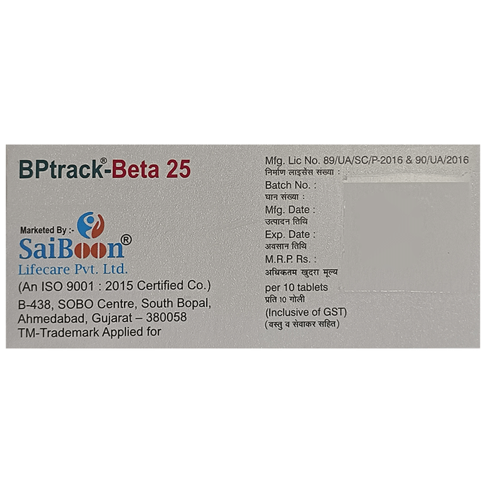 In Treatment of Hypertension (high blood pressure) Hypertension or an increase in blood pressure occurs when the blood vessels that supply blood to your heart become narrow. As a result of this, blood cannot flow smoothly to the heart, heart rate increases and it fails to pump blood effectively to other parts of the body. This puts a strain on the heart that can cause a chest pain or even a heart attack. u003cbr>Bptrack-Beta 25 Tablet ER reduces pressure in the blood vessels. It relaxes the blood vessels so that blood can flow more easily to your heart. This reduces strain on the heart and slows down heart rate. This further reduces the risk of having a stroke, a heart attack, or kidney problems in the future. u003cbr>You do not usually feel any direct benefit from taking this medicine, but it works in the long term to keep you well. You should take it regularly as prescribed for this medicine to be most effective, even if you feel better.