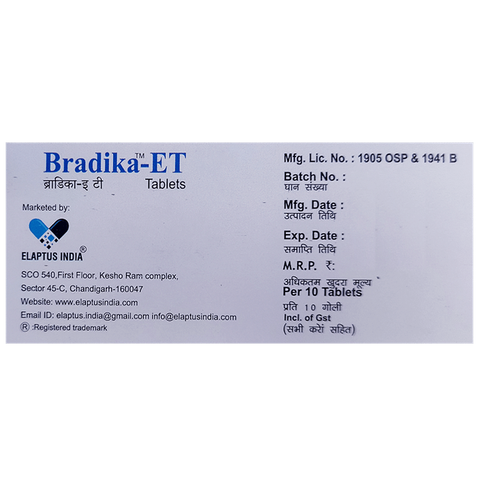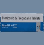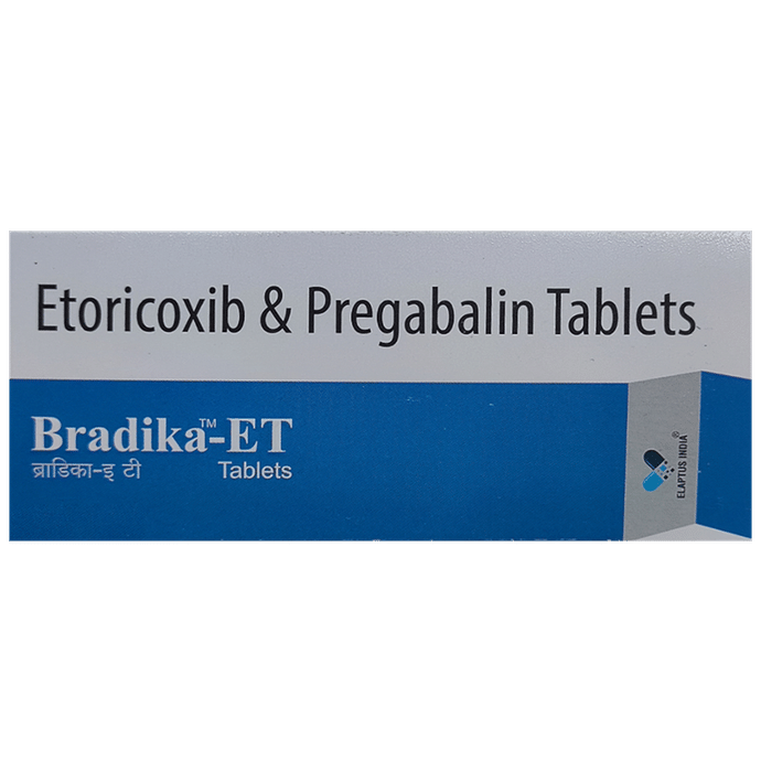 Bradika-ET Tablet is a combination of two medicines. It is used in the treatment of pain caused due to nerve damage (neuropathic pain). Bradika-ET Tablet can be taken with or without food, but it is important to take this medicine at the same time each day to get the most benefit. The exact dose and duration of treatment will depend on your condition and how you respond to it. Your doctor will probably start this medicine at a low dose and increase it gradually. It may take a few weeks for the medicine to work properly. Follow your doctor’s instructions and continue taking it regularly until your doctor advises you to stop. Do not miss any dose, otherwise, your condition may worsen.The side effects of this medicine are usually mild and go away by themselves. The most common ones are feeling sleepy or dizzy, dryness in the mouth, blurred vision, weight gain, edema (swelling over the whole body), and difficulty in concentrating. Most side effects are not serious and do not need medical attention. Talk to your doctor about potential side effects and ways in which you might prevent or cope with them.Before taking the medicine you should tell your doctor if you are pregnant, breastfeeding or planning to become pregnant. Be careful while driving as sleepiness, dizziness, and blurring of vision may be seen as side effects. You should avoid drinking alcohol along with this medicine as it may lead to excessive sleepiness and dizziness.