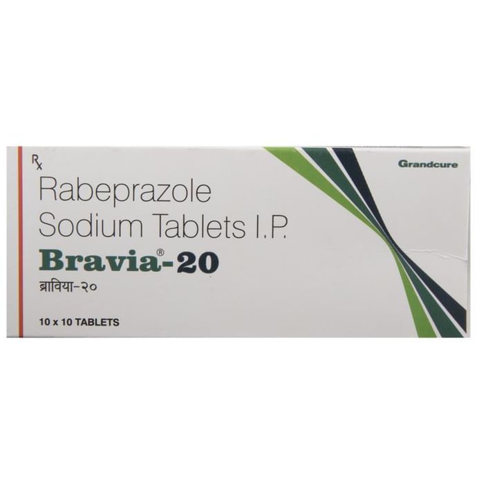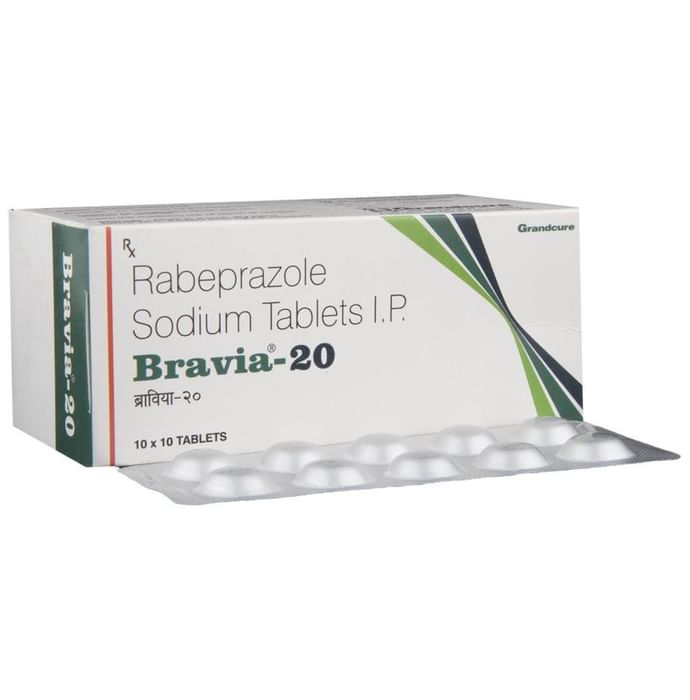 Bravia 20 Tablet is a medicine that reduces the amount of acid produced in your stomach. It is used in the treatment of acid-related diseases of the stomach and intestine such as acid reflux, peptic ulcer disease, and Zollinger-Ellison syndrome. It provides relief from symptoms and promotes healing. Bravia 20 Tablet medicine should be taken one hour before a meal, preferably in the morning. The dose will depend on your underlying condition and how you respond to the medicine. Try to take it regularly at the same time each day as advised by your doctor. You should keep on taking it as prescribed even if your symptoms disappear quickly. You may be able to help improve your symptoms by eating smaller meals more often and avoiding caffeinated drinks like tea and coffee, and spicy or fatty foods.This medicine’s most common side effects include nausea, vomiting, headache, dizziness, flatulence, diarrhea, and stomach pain. These tend to be mild but talk to your doctor if they bother you or do not go away. The risk of side effects may increase the longer you take this medicine. Long-term use (more than 1 year) may increase your risk for bone fractures, especially with higher doses. Talk to your doctor about ways to prevent bone loss (osteoporosis), like taking calcium and vitamin D supplements.Low blood magnesium levels (hypomagnesemia) have been seen in some people taking this medicine for 3 months or more. This may lead to tiredness, confusion, dizziness, muscle twitches, and an irregular heartbeat. Your doctor may monitor your magnesium levels to prevent this.Bravia 20 Tablet is not suitable for some people. Before taking this medicine, you need to tell your doctor if you have severe liver problems, are taking medicines for HIV, have ever had an allergic reaction to similar medicines in the past, or suffer from bone loss (osteoporosis). Pregnant or breastfeeding women should also consult their doctor before taking it. Avoid drinking alcohol as it makes your stomach produce excessive acid and can worsen your symptoms. Do not drive or use machinery or tools, if this medicine makes you feel dizzy or sleepy.