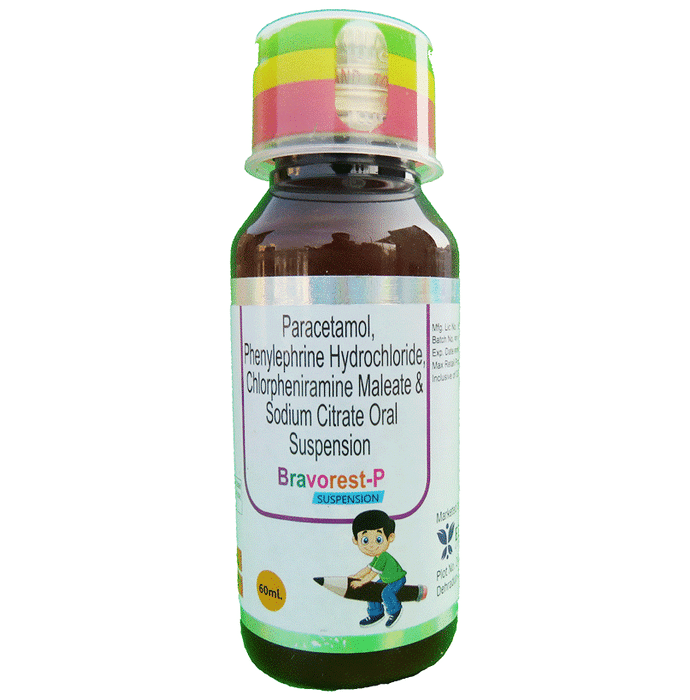 description:Bravorest-P Oral Suspension is commonly prescribed in children to treat symptoms such as runny nose, cough, sneezing, watery eyes, sore throat, body ache, and fever. These symptoms are usually associated with common cold, hay fever (allergic rhinitis), and other respiratory tract conditions. Give Bravorest-P Oral Suspension to your child by mouth with or without food. If your child develops a stomach upset, prefer giving it with food. Always remember that the dosing schedule provided by your child’s doctor depends on the type of symptoms your child has, so make sure to follow the prescribed dose, time, and way strictly.Give Bravorest-P Oral Suspension at a fixed time each day so that it gradually makes a place in your child’s daily routine, which will help you to remember. If your child vomits within 30 minutes of taking this medicine give the same dose again. However, never repeat the dose if it’s already time for the next dose. Your child may start to feel better within a week of regular dosing. However, you must continue giving the medicine to your child to finish the complete prescribed course as stopping it abruptly may worsen your child’s condition.Some of the minor and temporary side effects that your child may experience while taking this medicine include vomiting, diarrhea, nausea, dizziness, rash, and headache. Usually, these episodes subside once your child’s body adapts to the medicine. In case these side effects persist or become bothersome for your child, consult your child’s doctor without any delay.Narrate your child’s complete medical history to your child’s doctor, including any ongoing medicine regime or history of any allergy, heart problem, blood disorder, birth defects, airway obstruction, lung anomaly, skin disorder, liver impairment, and kidney malfunction. This information is critical for dose alterations and for planning your child’s overall treatment.