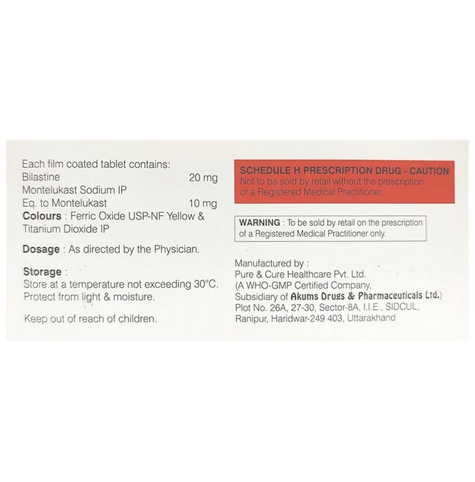 Marketer:Onamoy Healthcare LLP,Composition:Bilastine (20mg) + Montelukast (10mg), medicine_typedrugs,Packaging Detail:strip of 10 tablets,          Package:Strip,Qty:10,Product Form:Tablet, prescription_required:Prescription Required,primary_use: