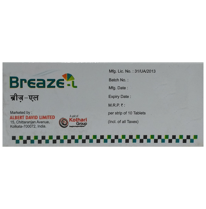 description:Breaze-L Tablet is a combination medicine used in the treatment of allergic symptoms such as runny nose, stuffy nose, sneezing, itching, swelling, watery eyes and congestion or stuffiness. It also reduces inflammation in the airways and make breathing easier. Breaze-L Tablet is taken with or without food in a dose and duration as advised by the doctor. The dose you are given will depend on your condition and how you respond to the medicine. You should keep taking this medicine for as long as your doctor recommends. If you stop treatment too early your symptoms may come back and your condition may worsen. Let your healthcare team know about all other medications you are taking as some may affect, or be affected by this medicine.The most common side effects are nausea, diarrhea, vomiting, dryness in the mouth, headache, skin rash, flu-like symptoms, and fatigue. Most of these are temporary and usually resolve with time. Contact your doctor straight away if you are at all concerned about any of these side effects. This medicine may cause dizziness and sleepiness, so do not drive or do anything that requires mental focus until you know how this medicine affects you. Avoid drinking alcohol while taking this medicine as it can worsen your sleepiness.Never support self-medication or recommend your medicine to another person. It is beneficial to have plenty of fluids while taking this medication. Before you start taking this medicine it is important to inform your doctor if you are suffering from kidney disease.