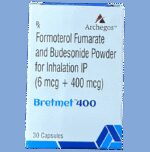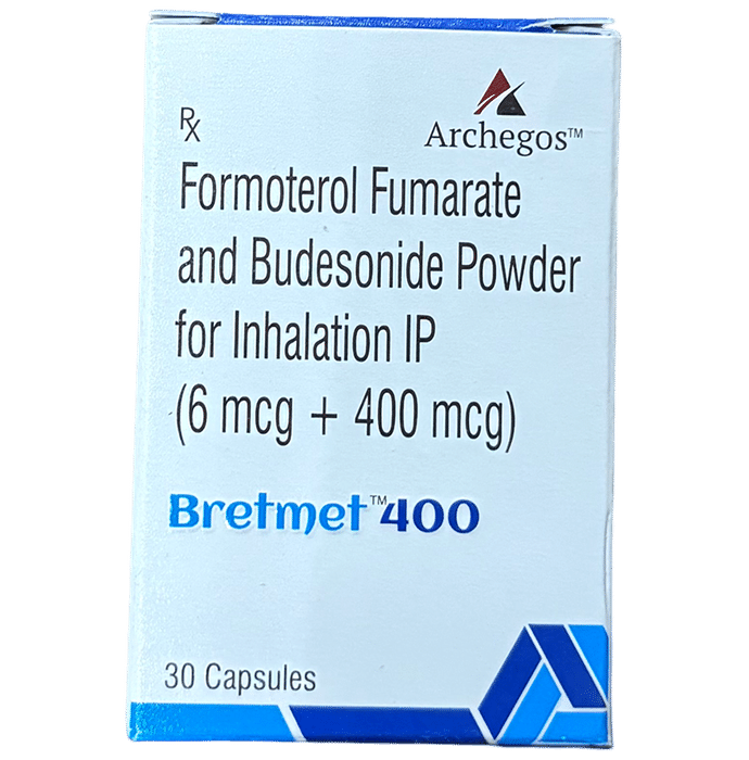 description:Bretmet 400 Capsule is a combination of two medicines in one inhaler. It relieves the long-term symptoms of asthma and COPD, making breathing easier. It works by inhibiting the release of certain chemical messengers that cause inflammation (swelling) and relaxes the muscles in the airways. Your doctor will tell you how often you need to use your inhaler. The effect of this medicine may be noticeable after a few days but will only reach its maximum after a few weeks. This medicine must be used regularly to be effective, so go on taking it even if you don’t have any symptoms. That means it’s doing its job. If you stop taking it your symptoms may get worse. This medicine should not be used to relieve sudden shortness of breath. If sudden shortness of breath occurs, use your rescue inhaler. To get the benefit from this medicine you need to make sure you get your inhaler technique right, otherwise, it does not work as well.The most common side effects include headache, nausea, vomiting, stomach discomfort, and respiratory tract infection. If you get there, don’t stop taking it but do talk to your doctor. You can prevent some of these symptoms by rinsing your mouth and throat with water or brushing your teeth after using your inhaler. There are other, rarer side effects which can be serious. Talk to your doctor if you’re worried about them.Before taking it, you should tell your doctor if you have any kidney or liver diseases so that your doctor can prescribe a suitable dose for you. You should also tell your doctor if you are pregnant, planning pregnancy or breastfeeding.