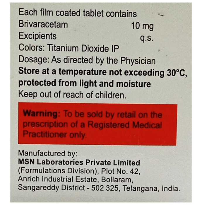Marketer:Eris Lifesciences Ltd,Composition:Brivaracetam (10mg), medicine_typedrugs,Packaging Detail:strip of 10 tablets,          Package:Strip,Qty:10,Product Form:Tablet, prescription_required:Prescription Required,primary_use: