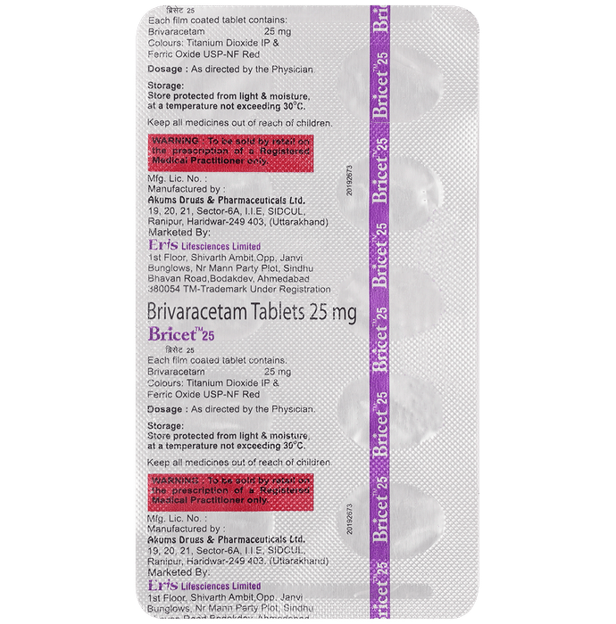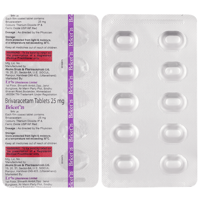description:Bricet 25mg Tablet is an anti-epileptic medicine used to treat seizures (fits) in epilepsy. It can be used alone or along with other medicines. It helps to prevent seizures for as long as you continue to take it. Bricet 25mg Tablet suppresses the abnormal electrical activity in the brain. You can take it regularly with or without food but try to take it at the same time each day to get the most benefit. The dose and how often you need it will be decided by your doctor so that you get the right amount to control your seizures. It may be increased gradually.It is generally advised as a long-term treatment. You should continue taking it for as long as your doctor has told you to, even if you feel well. If you stop or miss doses your seizures could get worse. Do not stop taking this medicine unless your doctor tells you to. This is because stopping the medicine suddenly could make your seizures worse.Some common side effects of this medicine include dizziness, headache, nausea, and vomiting. You may also experience behavioral changes, aggressive behavior, irritation, agitation, etc. Side effects are more common during the first few weeks and usually lessen as your body gets used to the medicine. Most of these side effects do not need medical attention, but some of them can be serious. A small number of people being treated with this medicine have had thoughts of harming or killing themselves. Contact your doctor if your mood changes for the worse.Before taking it, you should tell your doctor if you have liver or kidney-related problems, depression, or suicidal thoughts, and if you are pregnant or planning to become pregnant. Breastfeeding mothers should also consult their doctor before taking this medicine.