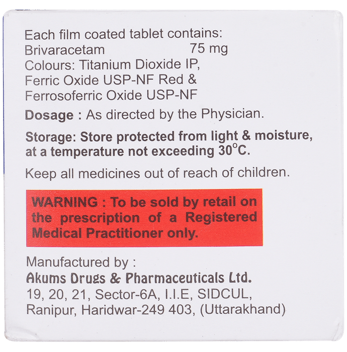 Marketer:Eris Lifesciences Ltd,Composition:Brivaracetam (75mg), medicine_typedrugs,Packaging Detail:strip of 10 tablets,          Package:Strip,Qty:10,Product Form:Tablet, prescription_required:Prescription Required,primary_use: