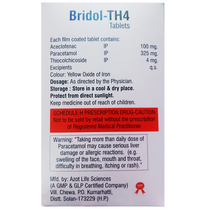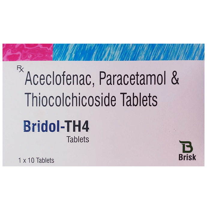 description:Bridol-TH 4 Tablet is a combination medicine that helps in relieving muscular pain. It works by blocking the release of certain chemical messengers that cause pain, inflammation, and fever. This improves the movement of muscles and provides relief from pain and discomfort. Bridol-TH 4 Tablet should be taken with food. This will prevent you from getting an upset stomach. The dose and duration will depend on the severity of your condition. You should keep taking the medicine even if you feel better until the doctor says it is alright to stop using it.Using this medicine may cause few common side effects such as nausea, vomiting, heartburn, stomach pain, diarrhea, loss of appetite, and dryness in the mouth. If any of these side effects do not resolve with time or get worse, you should let your doctor know. Your doctor may be able to suggest ways of preventing or reducing the side effects. In general, you should try to use the smallest amount necessary to control your symptoms.Before using the medicine, you should tell your doctor if you have any other medical conditions or disorders. To make sure it is safe, you should let your doctor know all the other medicines you are taking. Also, tell your doctor if you have any problems with your liver or kidneys. You should avoid the consumption of alcohol while on treatment with this medicine. Pregnant and breastfeeding women should consult their doctors first before using the medicine.