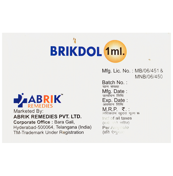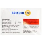 description:Brikdol 75mg Injection is a pain-relieving medicine. It is used to treat pain, swelling, stiffness, and joint pain in conditions like rheumatoid arthritis, osteoarthritis, and acute musculoskeletal injuries. It is given in cases where oral administration is not possible. Brikdol 75mg Injection is administered as an injection by a healthcare professional. Kindly do not self administer. Inform your doctor if you have any history of heart disease or stroke. Please consult your doctor in case any injection site reactions like pain, swelling, or redness are observed.The most common side effects of this medicine include nausea, vomiting, headache, and injection site reactions. Your doctor may regularly monitor your kidney function, liver function, and levels of blood components if you are taking this medicine for long-term treatment. Long term use may lead to serious complications such as stomach bleeding and kidney problems.