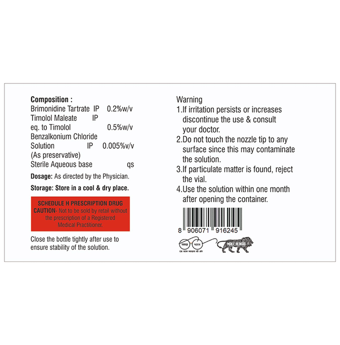 Marketer:Care Formulation Labs Pvt Ltd,Composition:Timolol (0.5% w/v) + Brimonidine (0.2% w/v), medicine_typedrugs,Packaging Detail:bottle of 5 ml Ophthalmic Solution, Package:Bottle,Qty:5 ml,Product Form:Ophthalmic Solution, prescription_required:Prescription Required,primary_use: