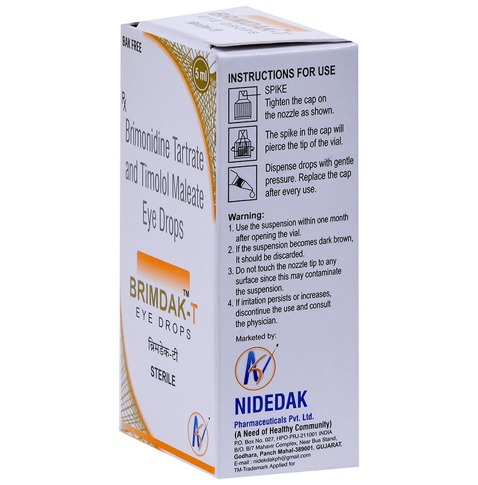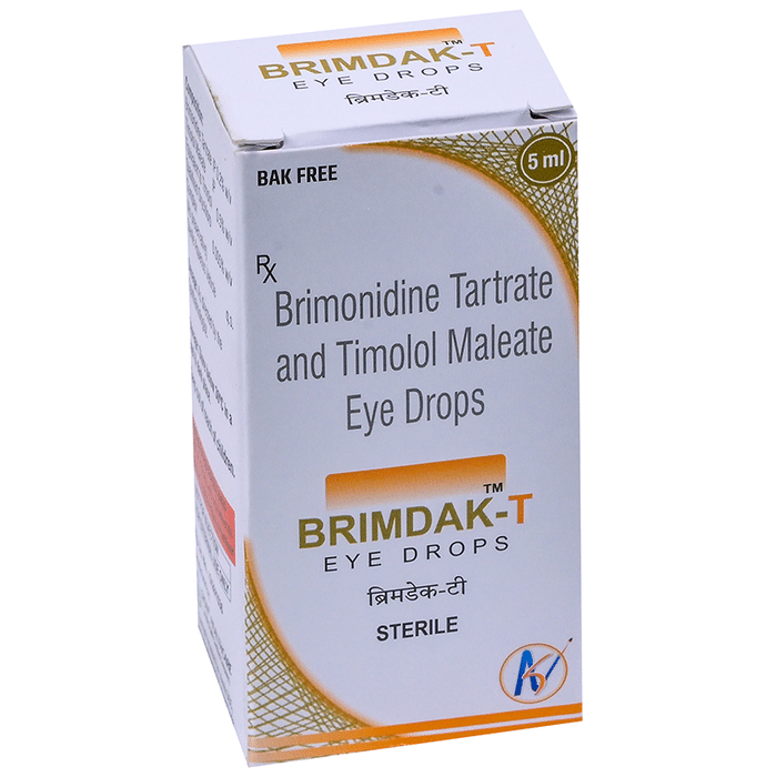 description:Brimdak-T Eye Drop Bak Free is a prescription medicine used for the treatment of pressure in the eyes (ocular hypertension) and glaucoma. It works by decreasing the pressure of fluid in the eye (aqueous humor), which helps in lowering the increased eye pressure. Brimdak-T Eye Drop Bak Free is to be used only in the affected eye in the dose and duration as advised by the doctor. Wash your hands before using this medicine. Check the label thoroughly for directions before use. Do not skip any doses and finish the full course of treatment even if you feel better.The most common side effects include burning, irritation, itching, and redness at the application site, sleepiness, and decreased alertness. If these side effects persist for a longer duration, inform your doctor. In case of accidental contact with your nose or mouth, immediately rinse it off with plenty of water. Do not drive or operate heavy machinery immediately after the use of this medicine as it may cause temporary blurring of vision and may affect your ability to drive.