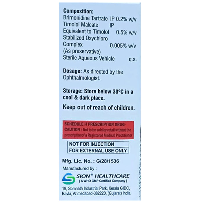 Marketer:Nidedak Pharmaceuticals Private Limited,Composition:Timolol (0.5% w/v) + Brimonidine (0.2% w/v), medicine_typedrugs,Packaging Detail:bottle of 5 ml Eye Drop, Package:Bottle,Qty:5 ml,Product Form:Eye Drop, prescription_required:Prescription Required,primary_use: