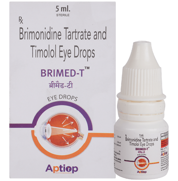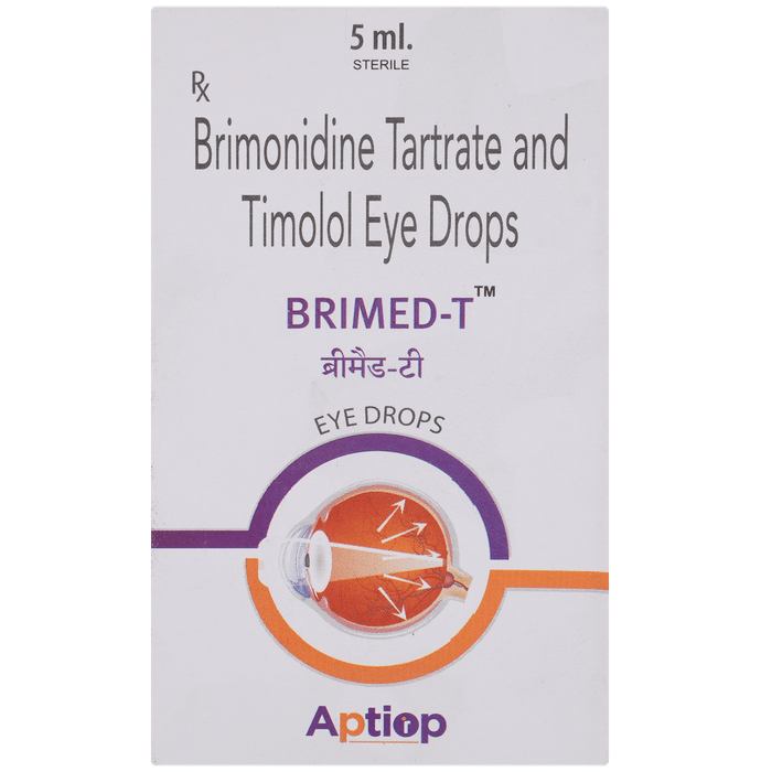description:Brimed T Eye Drop is a prescription medicine used for the treatment of pressure in the eyes (ocular hypertension) and glaucoma. It works by decreasing the pressure of fluid in the eye (aqueous humor), which helps in lowering the increased eye pressure. Brimed T Eye Drop is to be used only in the affected eye in the dose and duration as advised by the doctor. Wash your hands before using this medicine. Check the label thoroughly for directions before use. Do not skip any doses and finish the full course of treatment even if you feel better.The most common side effects include burning, irritation, itching, and redness at the application site, sleepiness, and decreased alertness. If these side effects persist for a longer duration, inform your doctor. In case of accidental contact with your nose or mouth, immediately rinse it off with plenty of water. Do not drive or operate heavy machinery immediately after the use of this medicine as it may cause temporary blurring of vision and may affect your ability to drive.