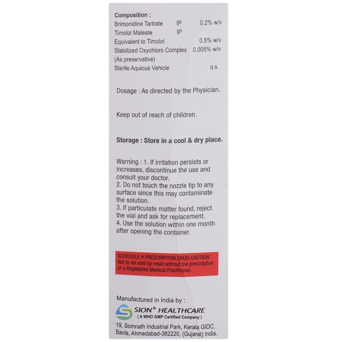 Marketer:Raymed Pharmaceuticals Ltd,Composition:Timolol (0.5% w/v) + Brimonidine (0.2% w/v), medicine_typedrugs,Packaging Detail:bottle of 5 ml Eye Drop,                   Package:Bottle,Qty:5 ml,Product Form:Eye Drop, prescription_required:Prescription Required,primary_use: