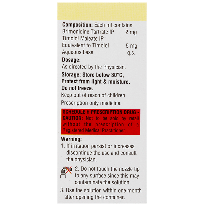 Marketer:Maypharm Lifesciences,Composition:Timolol (5mg/ml) + Brimonidine (2mg/ml), medicine_typedrugs,Packaging Detail:bottle of 5 ml Ophthalmic Solution,                   Package:Bottle,Qty:5 ml,Product Form:Ophthalmic Solution, prescription_required:Prescription Required,primary_use: