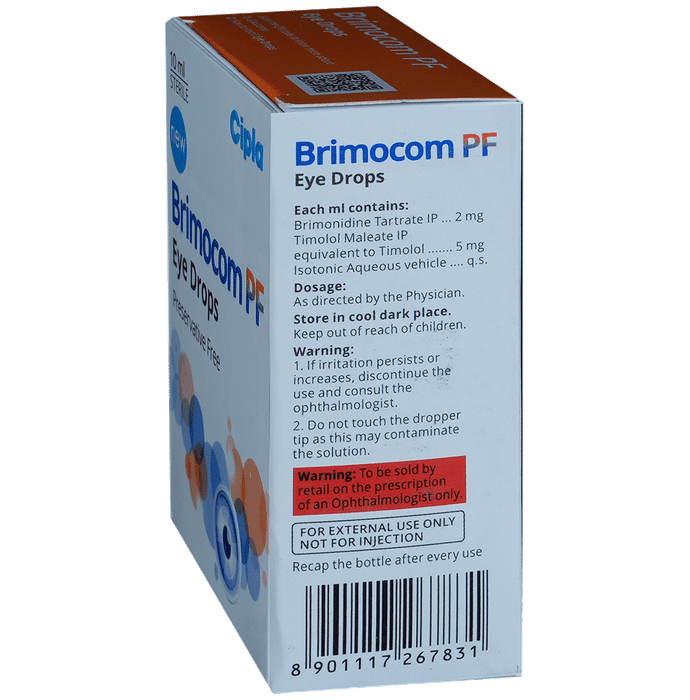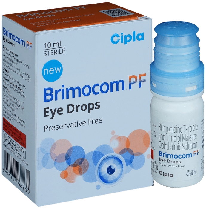 description:Brimocom PF Eye Drop is a prescription medicine used for the treatment of pressure in the eyes (ocular hypertension) and glaucoma. It works by decreasing the pressure of fluid in the eye (aqueous humor), which helps in lowering the increased eye pressure. Brimocom PF Eye Drop is to be used only in the affected eye in the dose and duration as advised by the doctor. Wash your hands before using this medicine. Check the label thoroughly for directions before use. Do not skip any doses and finish the full course of treatment even if you feel better.The most common side effects include burning, irritation, itching, and redness at the application site, sleepiness, and decreased alertness. If these side effects persist for a longer duration, inform your doctor. In case of accidental contact with your nose or mouth, immediately rinse it off with plenty of water. Do not drive or operate heavy machinery immediately after the use of this medicine as it may cause temporary blurring of vision and may affect your ability to drive.