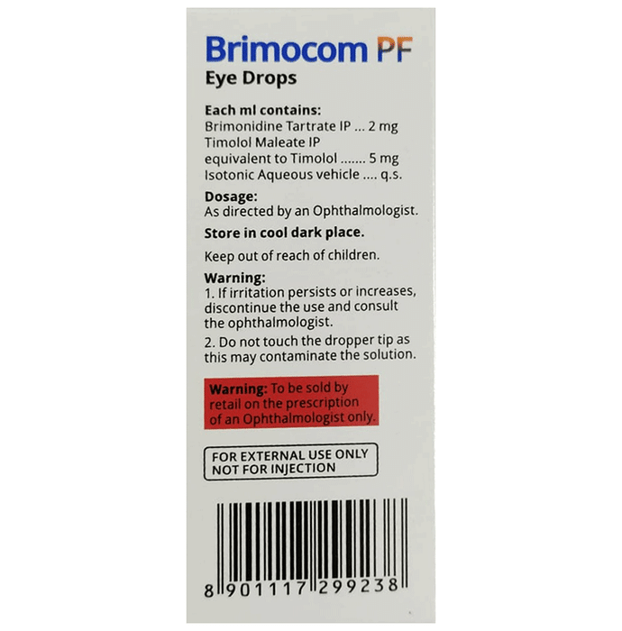 description:Brimocom PF Eye Drop is a prescription medicine used for the treatment of pressure in the eyes (ocular hypertension) and glaucoma. It works by decreasing the pressure of fluid in the eye (aqueous humor), which helps in lowering the increased eye pressure.Brimocom PF Eye Drop is to be used only in the affected eye in the dose and duration as advised by the doctor. Wash your hands before using this medicine. Check the label thoroughly for directions before use. Do not skip any doses and finish the full course of treatment even if you feel better.The most common side effects include burning, irritation, itching, and redness at the application site, sleepiness, and decreased alertness. If these side effects persist for a longer duration, inform your doctor. In case of accidental contact with your nose or mouth, immediately rinse it off with plenty of water. Do not drive or operate heavy machinery immediately after the use of this medicine as it may cause temporary blurring of vision and may affect your ability to drive.