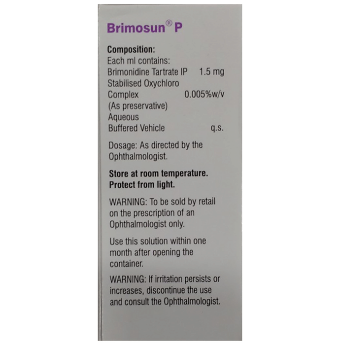 description:Brimosun P Eye Drop is a medicine used in the treatment of glaucoma. It decreases the fluid (aqueous humor) production in the eye which relieves the pressure in the eye. This way it relieves the symptom and speeds up the healing. Brimosun P Eye Drop is to be used only in the affected eye in the dose and duration as advised by the doctor. Wash your hands before using this medicine. It is advised to check the label for directions before use. Do not skip any doses and finish the full course of treatment even if you feel better.The most common side effects include itching, stinging, redness, and burning sensation at the site of application, and foreign body sensation.In case of accidental contact with your ears, nose, or mouth, immediately rinse it with water.Inform your doctor if you have a known allergy to any of the ingredients in this medicine or if you are taking any other medication. It is advised not to drive or operate heavy machinery immediately after using this medicine as it may cause temporary blurring of vision and may affect your ability to drive.
