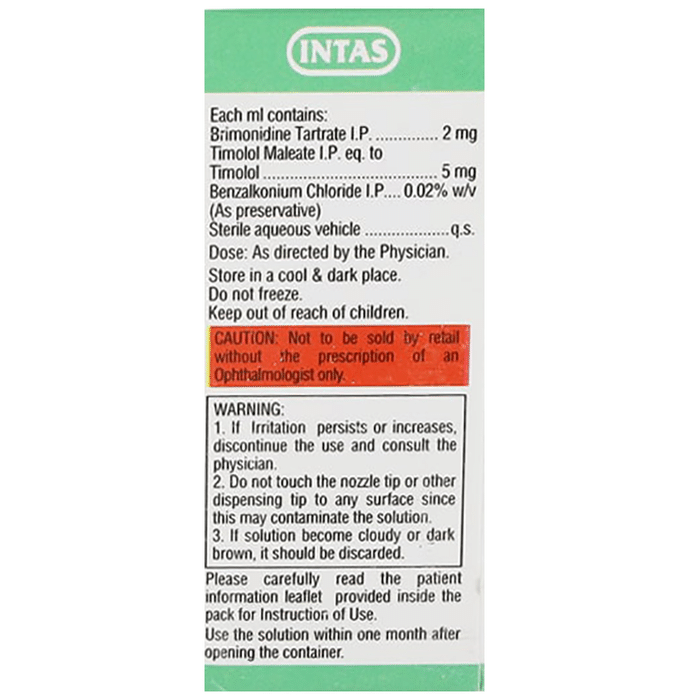Marketer:Intas Pharmaceuticals Ltd,Composition:Timolol (5mg) + Brimonidine (2mg), medicine_typedrugs,Packaging Detail:packet of 5 ml Eye Drop,          Package:Packet,Qty:5 ml,Product Form:Eye Drop, prescription_required:Prescription Required,primary_use: