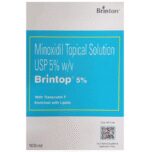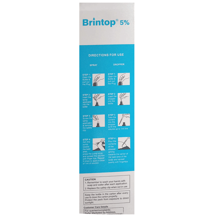 description:Brintop 5% Solution belongs to a class of drugs known as vasodilators. It is used to promote hair growth in men with male pattern baldness.Brintop 5% Solution should only be applied directly to the scalp area in the amount and in the way specified on the label or by your doctor. Clean and dry your scalp before using it. It may take approximately 2- 4 months before you notice any hair growth. The first growth may be soft, colourless, and barely visible. Using more than recommended will not speed up hair growth and may increase the likelihood of side effects. This medication must be used continuously to maintain hair growth. Tell your doctor if your condition does not improve or worsen after using it for 4 to 6 months.The most common side effects of this medicine include itching, excessive hair growth, rash, and dermatitis. In case of accidental application in other areas, it may result in unwanted hair growth. Rinse thoroughly with plenty of water if you get it in your eyes, mouth, or broken skin. Talk to your doctor if you are bothered by the side effects or if they do not go away.People under 18 or over 65 should not usually use Brintop 5% Solution. It may also not be appropriate if your hair loss is due to medications (such as chemotherapy) or any nutritional deficiency. You should also not use this medicine if you have high blood pressure or use other creams or lotions to treat other scalp conditions. Talk to your doctor if you have heart disease or blood circulation problems.