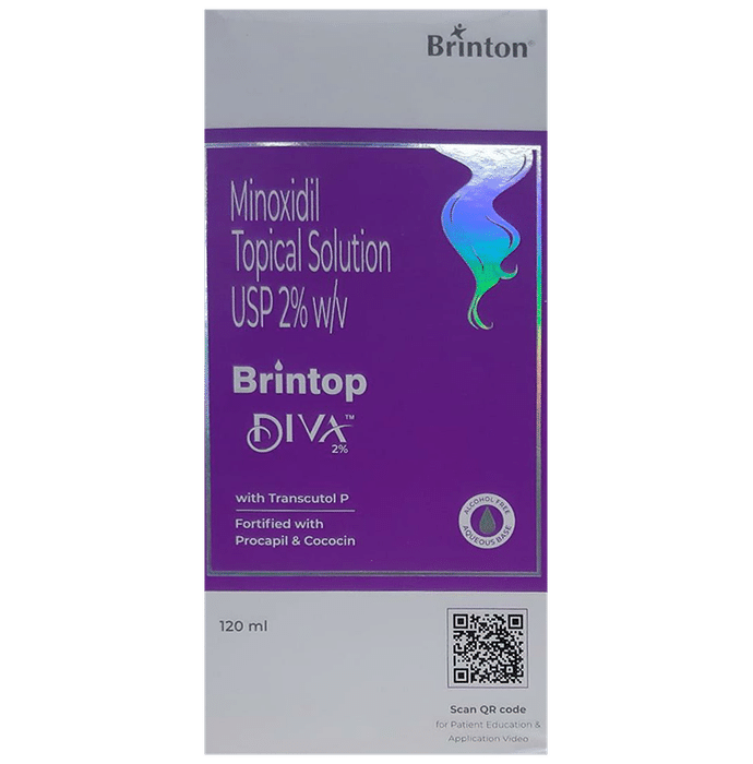 description:Brintop Diva 2% Topical Solution belongs to a class of drugs known as vasodilators. It is used to promote hair growth in men with male pattern baldness. Brintop Diva 2% Topical Solution should only be applied directly to the scalp area in the amount and in the way specified on the label or by your doctor. Clean and dry your scalp before using it. It may take approximately 2- 4 months before you notice any hair growth. The first growth may be soft, colourless, and barely visible. Using more than recommended will not speed up hair growth and may increase the likelihood of side effects. This medication must be used continuously to maintain hair growth. Tell your doctor if your condition does not improve or worsen after using it for 4 to 6 months.The most common side effects of this medicine include itching, excessive hair growth, rash, and dermatitis. In case of accidental application in other areas, it may result in unwanted hair growth. Rinse thoroughly with plenty of water if you get it in your eyes, mouth, or broken skin. Talk to your doctor if you are bothered by the side effects or if they do not go away.People under 18 or over 65 should not usually use Brintop Diva 2% Topical Solution. It may also not be appropriate if your hair loss is due to medications (such as chemotherapy) or any nutritional deficiency. You should also not use this medicine if you have high blood pressure or use other creams or lotions to treat other scalp conditions. Talk to your doctor if you have heart disease or blood circulation problems.