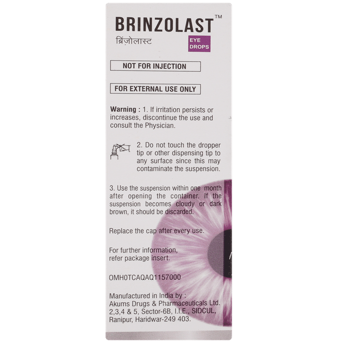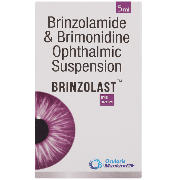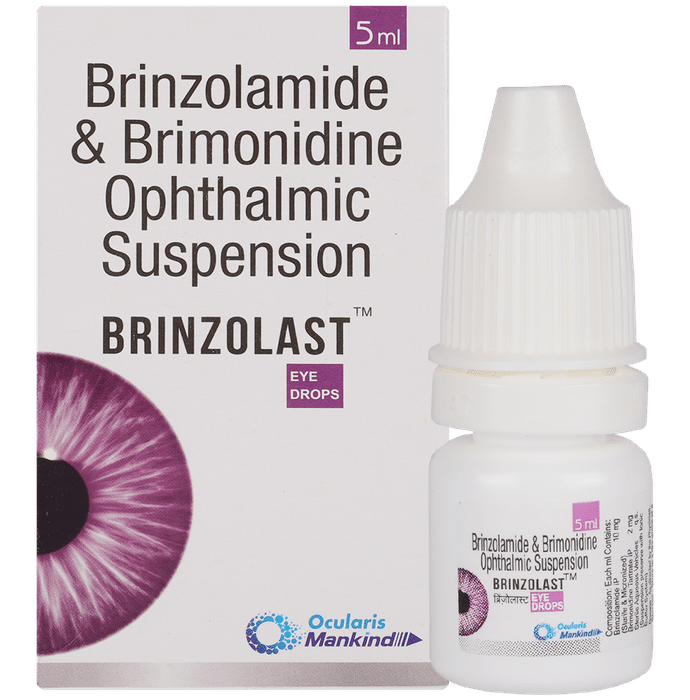 description:Brinzolast Eye Drop is a prescription medicine having a combination of medicines that is used to treat glaucoma. It works by decreasing the pressure of fluid in the eye (aqueous humor), which helps in lowering the increased eye pressure. Brinzolast Eye Drop is to be used only in the affected eye in the dose and duration as advised by the doctor. Wash your hands before using this medicine. It is advised to check the label for directions before use. Do not skip any doses and finish the full course of treatment even if you feel better.The most common side effects include burning sensation, irritation, itching, and redness at the application site. If these side effects persist for a longer duration, inform your doctor. In case of accidental contact with your ears, nose, or mouth, immediately rinse it off with water. It is advised not to drive or operate heavy machinery immediately after using this medicine as it may cause temporary blurring of vision.
