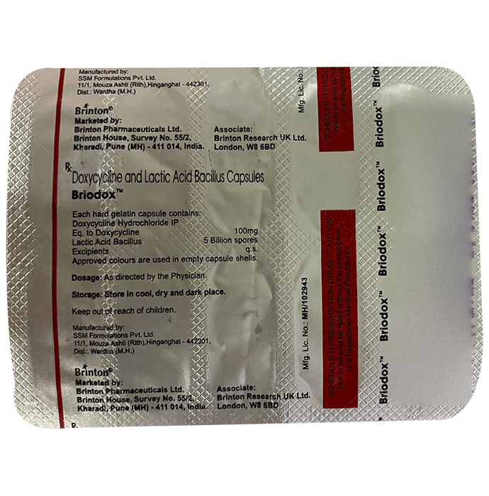 Marketer:Brinton Pharmaceuticals Pvt Ltd,Composition:Doxycycline (100mg) + Lactobacillus (5Billion Spores), medicine_typedrugs,Packaging Detail:strip of 10 tablets,                   Package:Strip,Qty:10,Product Form:Tablet, prescription_required:Prescription Required,primary_use: