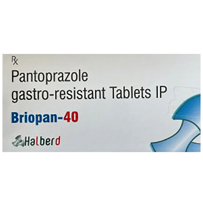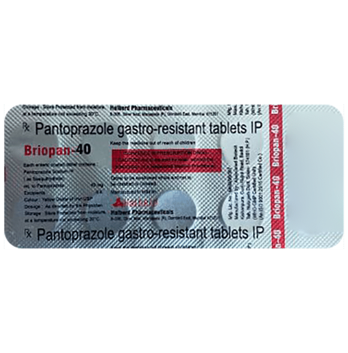 description:Briopan 40 Tablet is a medicine that reduces the amount of acid produced in your stomach. It is used for treating acid-related diseases of the stomach and intestine such as heartburn, acid reflux, peptic ulcer disease, and Zollinger-Ellison syndrome. It provides relief from the symptoms and promotes healing. Briopan 40 Tablet is also used to prevent stomach ulcers and acidity that may be seen with the prolonged use of painkillers. It belongs to a class of medicines known as proton pump inhibitors (PPIs). This medicine should be taken one hour before a meal, preferably in the morning. The dose will depend on your underlying condition and how you respond to the medicine. You should keep on taking it as prescribed even if your symptoms disappear quickly. You can increase the efficiency of the treatment by eating smaller meals more often and avoiding caffeinated drinks (like tea and coffee), and spicy or fatty foods.The most common side effects observed with this medicine include nausea, vomiting, headache, dizziness, flatulence, diarrhea, and stomach pain. These symptoms are generally mild but if they bother you or do not go away, consult your doctor. Long-term use of this medicine may lead to an increased risk of side effects. For instance, using this medicine for more than 1 year may increase your risk for bone fractures, especially with higher doses. Talk to your doctor about ways to prevent bone loss (osteoporosis), like taking calcium and vitamin D supplements.Before taking this medicine, you need to tell your doctor if you have severe liver problems, are taking medicines for HIV, have ever had an allergic reaction to similar medicines in the past, or suffer from bone loss (osteoporosis). Pregnant or breastfeeding women should also consult their doctor before taking it.