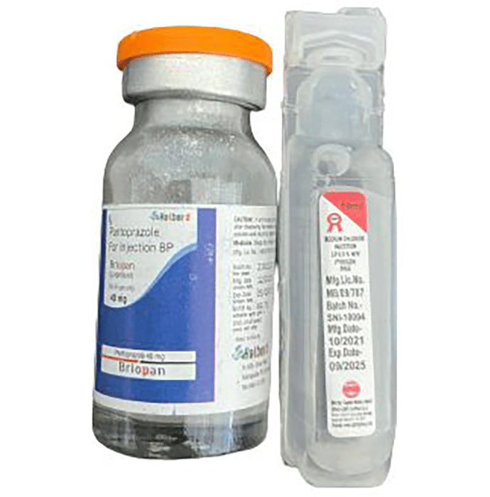 description:Briopan Injection is a medicine that reduces the amount of acid produced in your stomach. It is used for treating acid-related diseases of the stomach and intestine such as acid reflux, peptic ulcer disease, Zollinger-Ellison syndrome. It provides relief from symptoms and promotes healing. Briopan Injection is also used to prevent stress ulcers in seriously ill patients and is administered before anesthetic medication to help prevent aspiration-related complications. It belongs to a class of medicines known as proton pump inhibitors (PPIs). This medicine is administered into a vein by a healthcare professional and will only be given to you if your doctor thinks that an injection is more suitable for you at the moment than a tablet. The dose will depend on your underlying condition and how you respond to the medicine. Your doctor will decide the duration of treatment but you should keep on taking it as prescribed, even if your symptoms disappear quickly. You can increase the efficiency of the treatment by eating smaller meals more often and avoiding caffeinated drinks (like tea and coffee), and spicy or fatty foods.The most common side effects observed with this medicine include nausea, vomiting, headache, dizziness, flatulence, diarrhea, stomach pain, and thrombophlebitis (pain, redness, and swelling of the vein). These symptoms are generally mild but if they bother you or do not go away, consult your doctor. Long-term use of this medicine may lead to an increased risk of side effects. For instance, using this medicine for more than 1 year may increase your risk for bone fractures, especially with higher doses. Talk to your doctor about ways to prevent bone loss (osteoporosis), like taking calcium and vitamin D supplements.Briopan Injection is not suitable for some people. Before taking this medicine, you need to tell your doctor if you have severe liver problems, are taking medicines for HIV, have ever had an allergic reaction to similar medicines in the past, or suffer from bone loss (osteoporosis). Pregnant or breastfeeding women should also consult their doctor before taking it. Avoid drinking alcohol as it makes your stomach produce excessive acid and can worsen your symptoms. Do not drive or use machinery or tools, if this medicine makes you feel dizzy or sleepy.