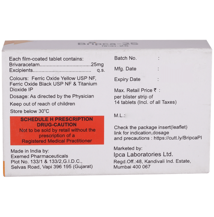 Marketer:Ipca Laboratories Ltd,Composition:Brivaracetam (25mg), medicine_typedrugs,Packaging Detail:strip of 14 tablets,                   Package:Strip,Qty:14,Product Form:Tablet, prescription_required:Prescription Required,primary_use: