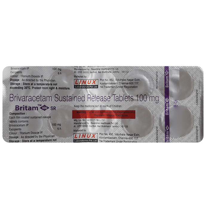 description:Britam 100 SR Tablet is an anti-epileptic medicine used to treat seizures (fits) in epilepsy. It can be used alone or along with other medicines. It helps to prevent seizures for as long as you continue to take it. Britam 100 SR Tablet suppresses the abnormal electrical activity in the brain. You can take it regularly with or without food but try to take it at the same time each day to get the most benefit. The dose and how often you need it will be decided by your doctor so that you get the right amount to control your seizures. It may be increased gradually.It is generally advised as a long-term treatment. You should continue taking it for as long as your doctor has told you to, even if you feel well. If you stop or miss doses your seizures could get worse. Do not stop taking this medicine unless your doctor tells you to. This is because stopping the medicine suddenly could make your seizures worse.Some common side effects of this medicine include dizziness, headache, nausea, and vomiting. You may also experience behavioral changes, aggressive behavior, irritation, agitation, etc. Side effects are more common during the first few weeks and usually lessen as your body gets used to the medicine. Most of these side effects do not need medical attention, but some of them can be serious. A small number of people being treated with this medicine have had thoughts of harming or killing themselves. Contact your doctor if your mood changes for the worse.Before taking it, you should tell your doctor if you have liver or kidney-related problems, depression, or suicidal thoughts, and if you are pregnant or planning to become pregnant. Breastfeeding mothers should also consult their doctor before taking this medicine.