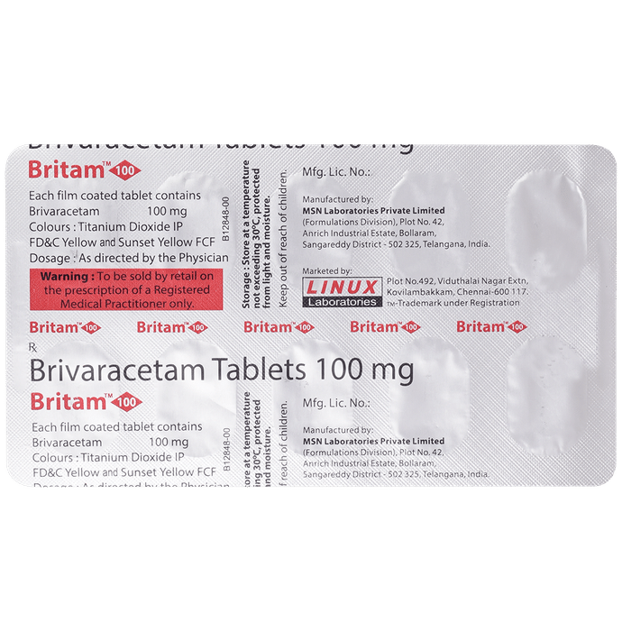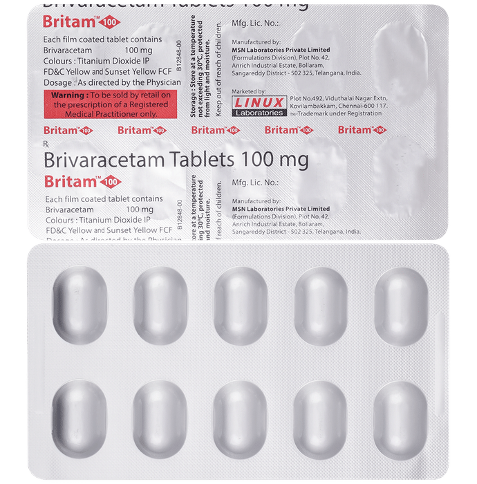 Marketer:Linux Laboratories,Composition:Brivaracetam (100mg), medicine_typedrugs,Packaging Detail:strip of 10 tablets,          Package:Strip,Qty:10,Product Form:Tablet, prescription_required:Prescription Required,primary_use: