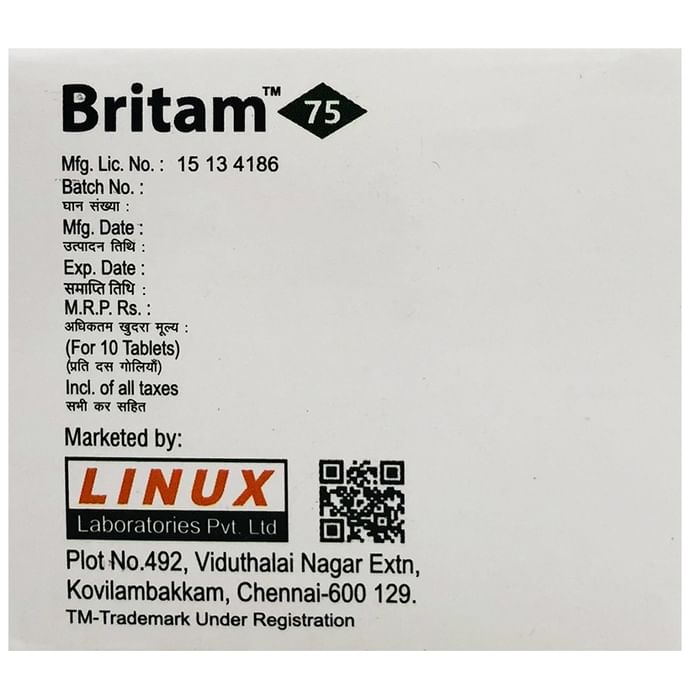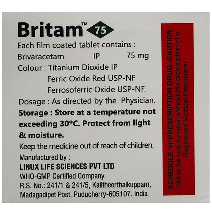 description:Britam 75mg Tablet is an anti-epileptic medicine used to treat seizures (fits) in epilepsy. It can be used alone or along with other medicines. It helps to prevent seizures for as long as you continue to take it. Britam 75mg Tablet suppresses the abnormal electrical activity in the brain. You can take it regularly with or without food but try to take it at the same time each day to get the most benefit. The dose and how often you need it will be decided by your doctor so that you get the right amount to control your seizures. It may be increased gradually.It is generally advised as a long-term treatment. You should continue taking it for as long as your doctor has told you to, even if you feel well. If you stop or miss doses your seizures could get worse. Do not stop taking this medicine unless your doctor tells you to. This is because stopping the medicine suddenly could make your seizures worse.Some common side effects of this medicine include dizziness, headache, nausea, and vomiting. You may also experience behavioral changes, aggressive behavior, irritation, agitation, etc. Side effects are more common during the first few weeks and usually lessen as your body gets used to the medicine. Most of these side effects do not need medical attention, but some of them can be serious. A small number of people being treated with this medicine have had thoughts of harming or killing themselves. Contact your doctor if your mood changes for the worse.Before taking it, you should tell your doctor if you have liver or kidney-related problems, depression, or suicidal thoughts, and if you are pregnant or planning to become pregnant. Breastfeeding mothers should also consult their doctor before taking this medicine.