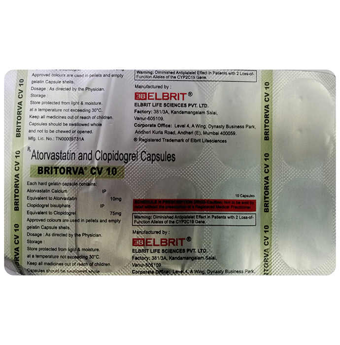 description:Britorva CV 10mg/75mg Capsule is a combination of two medicines used to prevent heart attack and stroke. This medicine reduces the ‘__’bad’__’ cholesterol (LDL) and triglycerides (fats) levels. Moreover, it also decreases the formation of blood clots. Britorva CV 10mg/75mg Capsule should be taken with food to avoid stomach upset. You should take it regularly at evenly spaced intervals as per the schedule prescribed by your doctor. Taking it at the same time every day will help you remember to take it. The dose and duration of treatment will depend on what you are being treated for. Do not stop taking it until you have finished the complete course, even when you feel better. Lifestyle changes like low-fat diet, exercise and not smoking may help this medicine to work better.Nausea, abdominal pain, and headache are some common side effects of this medicine. This medicine increases your risk of bleeding, so it is important to be careful while shaving, cutting nails, using sharp objects, or engaging in contact sports (e.g., football, wrestling). Let your doctor know if you notice yellowing of the skin, muscle pain or dark urine.Before taking this medicine, tell your doctor if you have liver or kidney disease or you are suffering from bleeding disorder. You must tell your doctor if you are pregnant, planning pregnancy or breastfeeding. You should also let your healthcare team know all other medicines you are taking as they may affect, or be affected by this medicine.