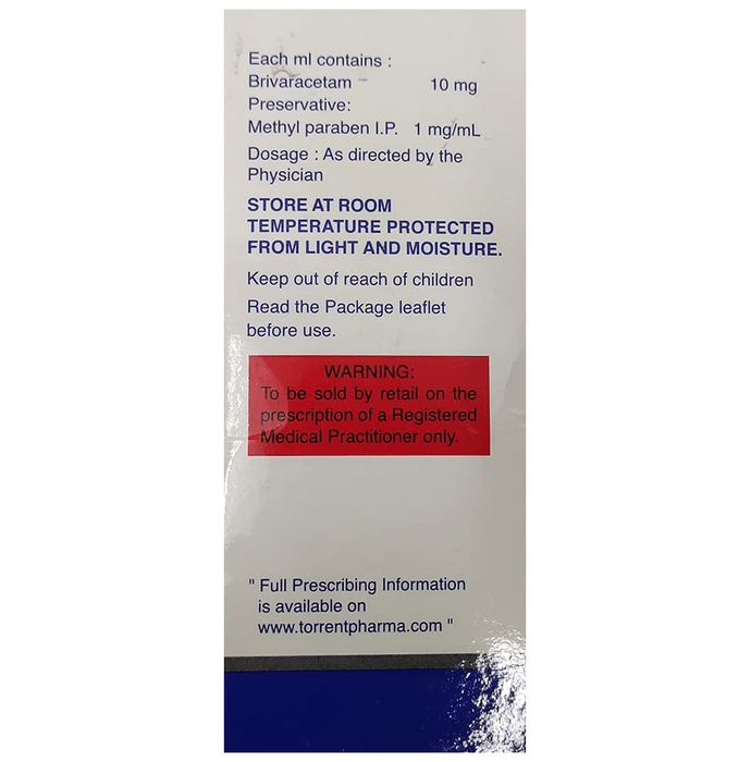 Marketer:Torrent Pharmaceuticals Ltd,Composition:Brivaracetam (10mg/ml), medicine_typedrugs,Packaging Detail:bottle of 100 ml Oral Solution,          Package:Bottle,Qty:100 ml,Product Form:Oral Solution, prescription_required:Prescription Required,primary_use: