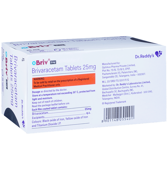 Marketer:Dr Reddy’s Laboratories Ltd,Composition:Brivaracetam (25mg), medicine_typedrugs,Packaging Detail:strip of 10 tablets,          Package:Strip,Qty:10,Product Form:Tablet, prescription_required:Prescription Required,primary_use: