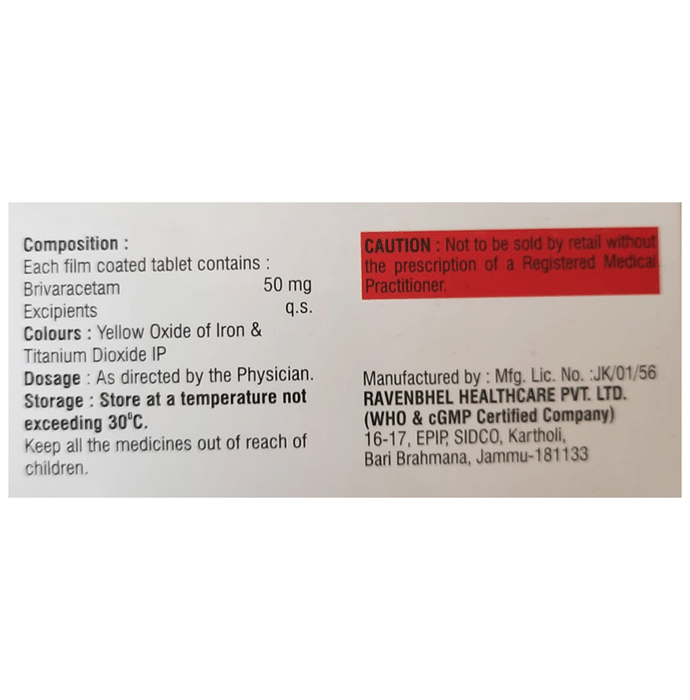 Marketer:Lyceum Life Sciences Pvt Ltd,Composition:Brivaracetam (50mg), medicine_typedrugs,Packaging Detail:strip of 10 tablets,          Package:Strip,Qty:10,Product Form:Tablet, prescription_required:Prescription Required,primary_use: