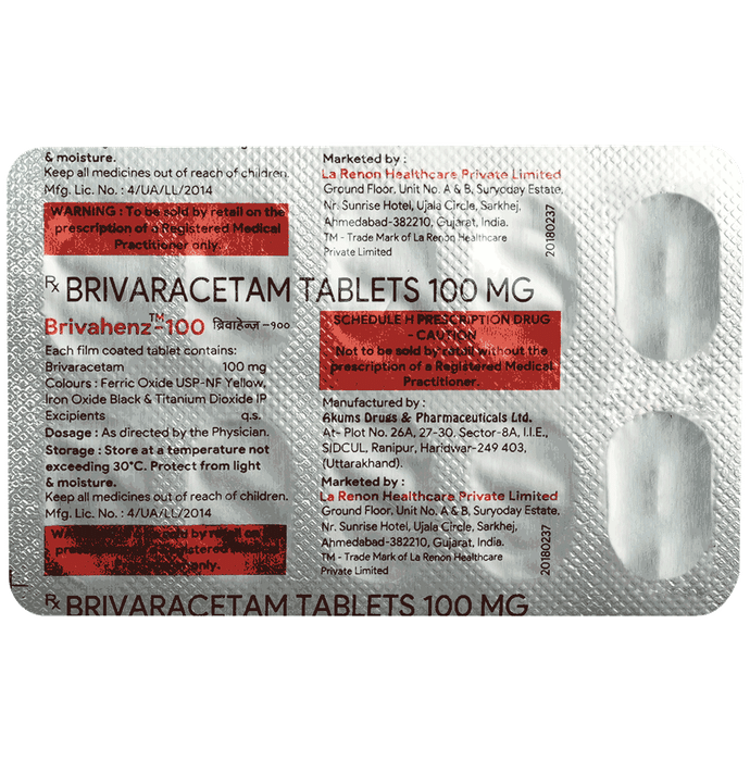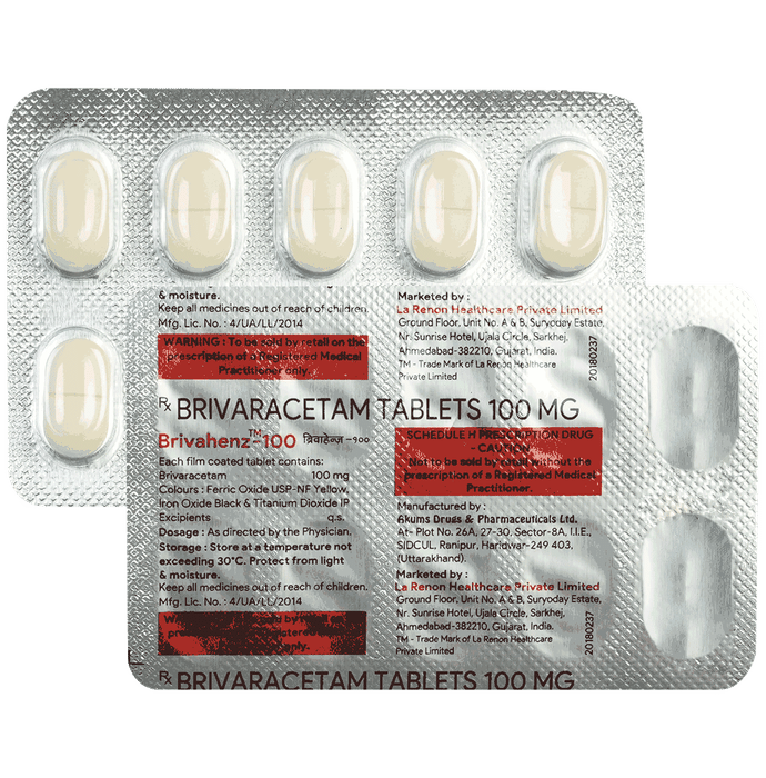 description:Brivahenz 100mg Tablet is an anti-epileptic medicine used to treat seizures (fits) in epilepsy. It can be used alone or along with other medicines. It helps to prevent seizures for as long as you continue to take it. Brivahenz 100mg Tablet suppresses the abnormal electrical activity in the brain. You can take it regularly with or without food but try to take it at the same time each day to get the most benefit. The dose and how often you need it will be decided by your doctor so that you get the right amount to control your seizures. It may be increased gradually.It is generally advised as a long-term treatment. You should continue taking it for as long as your doctor has told you to, even if you feel well. If you stop or miss doses your seizures could get worse. Do not stop taking this medicine unless your doctor tells you to. This is because stopping the medicine suddenly could make your seizures worse.Some common side effects of this medicine include dizziness, headache, nausea, and vomiting. You may also experience behavioral changes, aggressive behavior, irritation, agitation, etc. Side effects are more common during the first few weeks and usually lessen as your body gets used to the medicine. Most of these side effects do not need medical attention, but some of them can be serious. A small number of people being treated with this medicine have had thoughts of harming or killing themselves. Contact your doctor if your mood changes for the worse.Before taking it, you should tell your doctor if you have liver or kidney-related problems, depression, or suicidal thoughts, and if you are pregnant or planning to become pregnant. Breastfeeding mothers should also consult their doctor before taking this medicine.