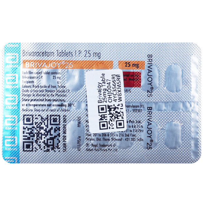 description:Brivajoy 25mg Tablet is an anti-epileptic medicine used to treat seizures (fits) in epilepsy. It can be used alone or along with other medicines. It helps to prevent seizures for as long as you continue to take it. Brivajoy 25mg Tablet suppresses the abnormal electrical activity in the brain. You can take it regularly with or without food but try to take it at the same time each day to get the most benefit. The dose and how often you need it will be decided by your doctor so that you get the right amount to control your seizures. It may be increased gradually.It is generally advised as a long-term treatment. You should continue taking it for as long as your doctor has told you to, even if you feel well. If you stop or miss doses your seizures could get worse. Do not stop taking this medicine unless your doctor tells you to. This is because stopping the medicine suddenly could make your seizures worse.Some common side effects of this medicine include dizziness, headache, nausea, and vomiting. You may also experience behavioral changes, aggressive behavior, irritation, agitation, etc. Side effects are more common during the first few weeks and usually lessen as your body gets used to the medicine. Most of these side effects do not need medical attention, but some of them can be serious. A small number of people being treated with this medicine have had thoughts of harming or killing themselves. Contact your doctor if your mood changes for the worse.Before taking it, you should tell your doctor if you have liver or kidney-related problems, depression, or suicidal thoughts, and if you are pregnant or planning to become pregnant. Breastfeeding mothers should also consult their doctor before taking this medicine.