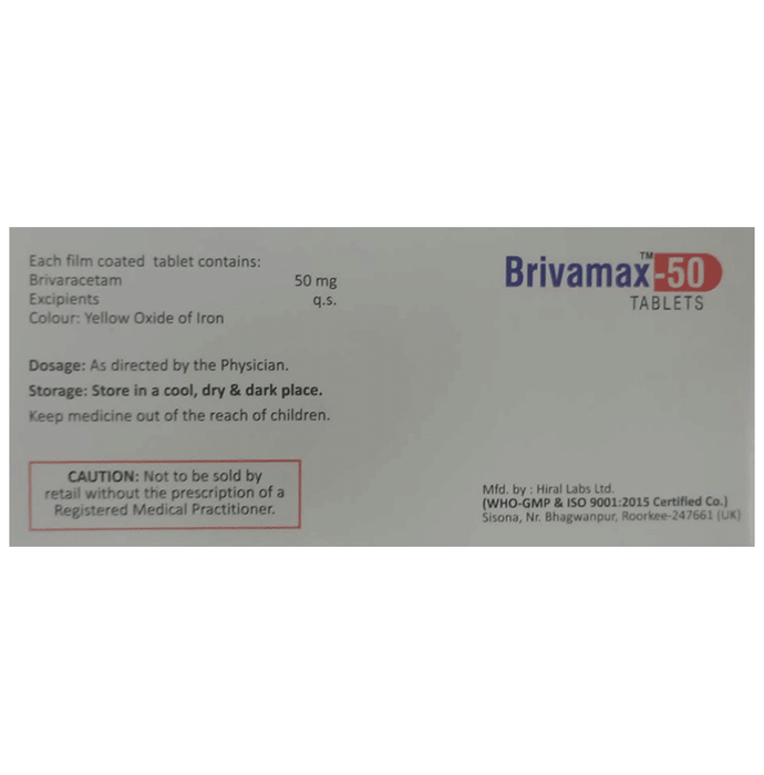 description:Brivamax 50 Tablet is an anti-epileptic medicine used to treat seizures (fits) in epilepsy. It can be used alone or along with other medicines. It helps to prevent seizures for as long as you continue to take it. Brivamax 50 Tablet suppresses the abnormal electrical activity in the brain. You can take it regularly with or without food but try to take it at the same time each day to get the most benefit. The dose and how often you need it will be decided by your doctor so that you get the right amount to control your seizures. It may be increased gradually.It is generally advised as a long-term treatment. You should continue taking it for as long as your doctor has told you to, even if you feel well. If you stop or miss doses your seizures could get worse. Do not stop taking this medicine unless your doctor tells you to. This is because stopping the medicine suddenly could make your seizures worse.Some common side effects of this medicine include dizziness, headache, nausea, and vomiting. You may also experience behavioral changes, aggressive behavior, irritation, agitation, etc. Side effects are more common during the first few weeks and usually lessen as your body gets used to the medicine. Most of these side effects do not need medical attention, but some of them can be serious. A small number of people being treated with this medicine have had thoughts of harming or killing themselves. Contact your doctor if your mood changes for the worse.Before taking it, you should tell your doctor if you have liver or kidney-related problems, depression, or suicidal thoughts, and if you are pregnant or planning to become pregnant. Breastfeeding mothers should also consult their doctor before taking this medicine.