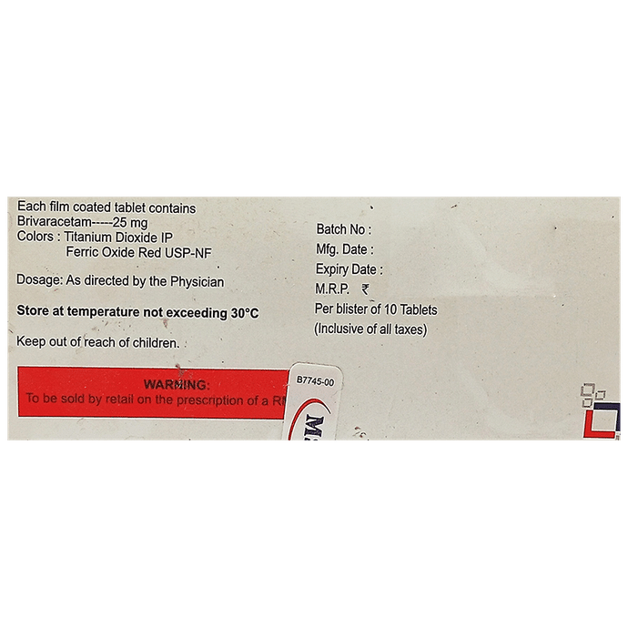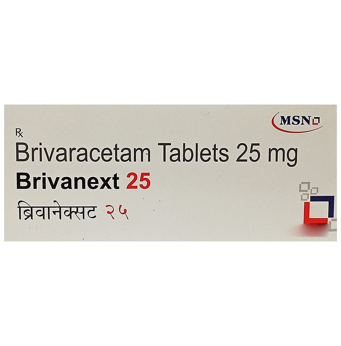 Marketer:MSN Laboratories,Composition:Brivaracetam (25mg), medicine_typedrugs,Packaging Detail:strip of 10 tablets,          Package:Strip,Qty:10,Product Form:Tablet, prescription_required:Prescription Required,primary_use: