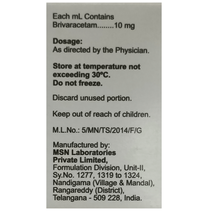 Marketer:MSN Laboratories,Composition:Brivaracetam (10mg/ml), medicine_typedrugs,Packaging Detail:vial of 5 ml Injection,                   Package:Vial,Qty:5 ml,Product Form:Injection, prescription_required:Prescription Required,primary_use: