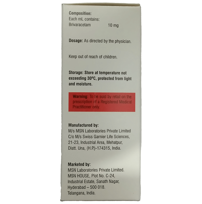 Marketer:MSN Laboratories,Composition:Brivaracetam (10mg), medicine_typedrugs,Packaging Detail:bottle of 100 ml Oral Solution,          Package:Bottle,Qty:100 ml,Product Form:Oral Solution, prescription_required:Prescription Required,primary_use: